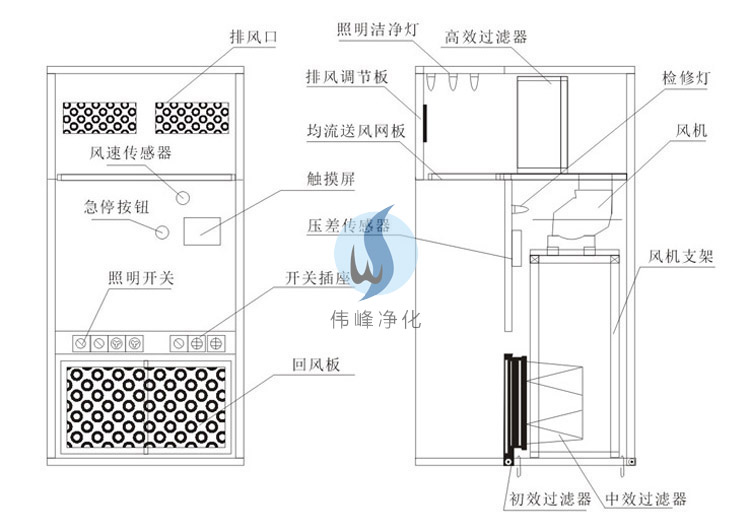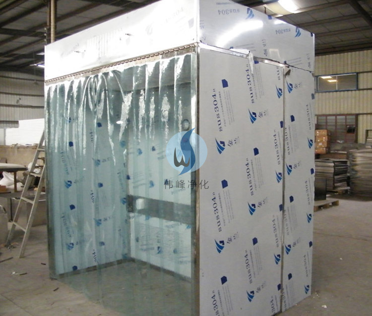 吴江伟峰净化生产的称量柜采用304不锈钢,工作区域墙板选用不锈钢 304(1.2 ㎜厚,油拉丝短丝,墙板内部圆弧角连接,无死角,保证工作区域的密封性和整洁美观,总体设计由初中效、风机箱、高效过滤器、散流器组成。本设备由工作区、回风箱体、风机箱体、出风箱体几大部分组装而成(见结构示意图)。控制面板位于设备内部工作区正面,采用优质控制系统(也可定制西门子控制系统),可以控制风机起停,调节风机频率,调整工作区需要的风速,并显示高效过滤器、工作区内外压差,风速。同时还对风速和压差报警。压差表是用来测量过滤器不同时期的压力,为称量罩提供持久的性能指示。初效根据使用情况需定期清洗。系统安装有二个压差传感器,并在触摸屏内显示数据,当压差超出范围时,在触摸屏上有显示报警,同时在自控箱上有声音报警。