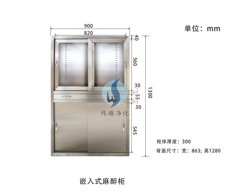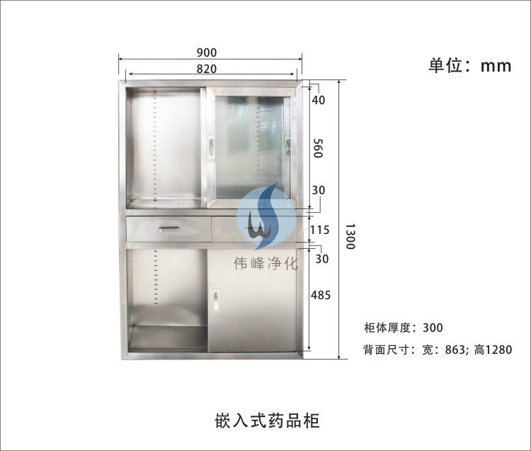 吴江伟峰净化生产的手术室器械柜是采用国际标准工艺制作,不锈钢板材制成,上门采用不锈钢双板密封框内钢化玻璃,内设钢化玻璃层板。下门采用不锈钢双板密封双开门,内设钢化玻璃层板。中间两个抽屉。表面亚光发纹视觉效果好,不晕目;嵌入式安装,符合国内手术室规范,便于器材管理;适用各种手术室功能要求,其45度拼角技术达到国际水平。